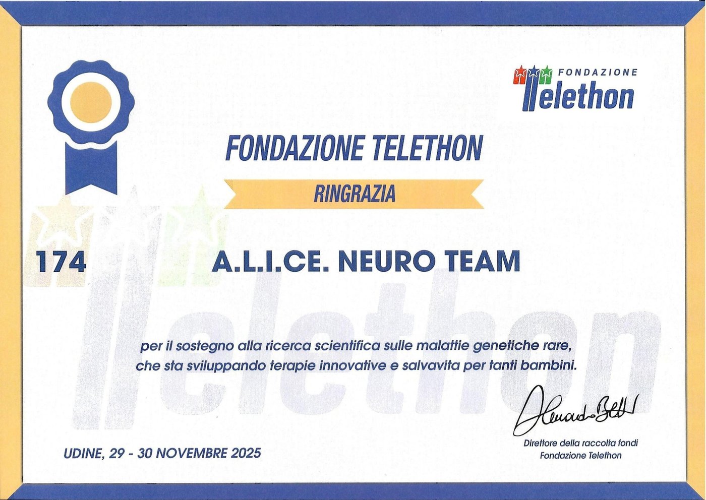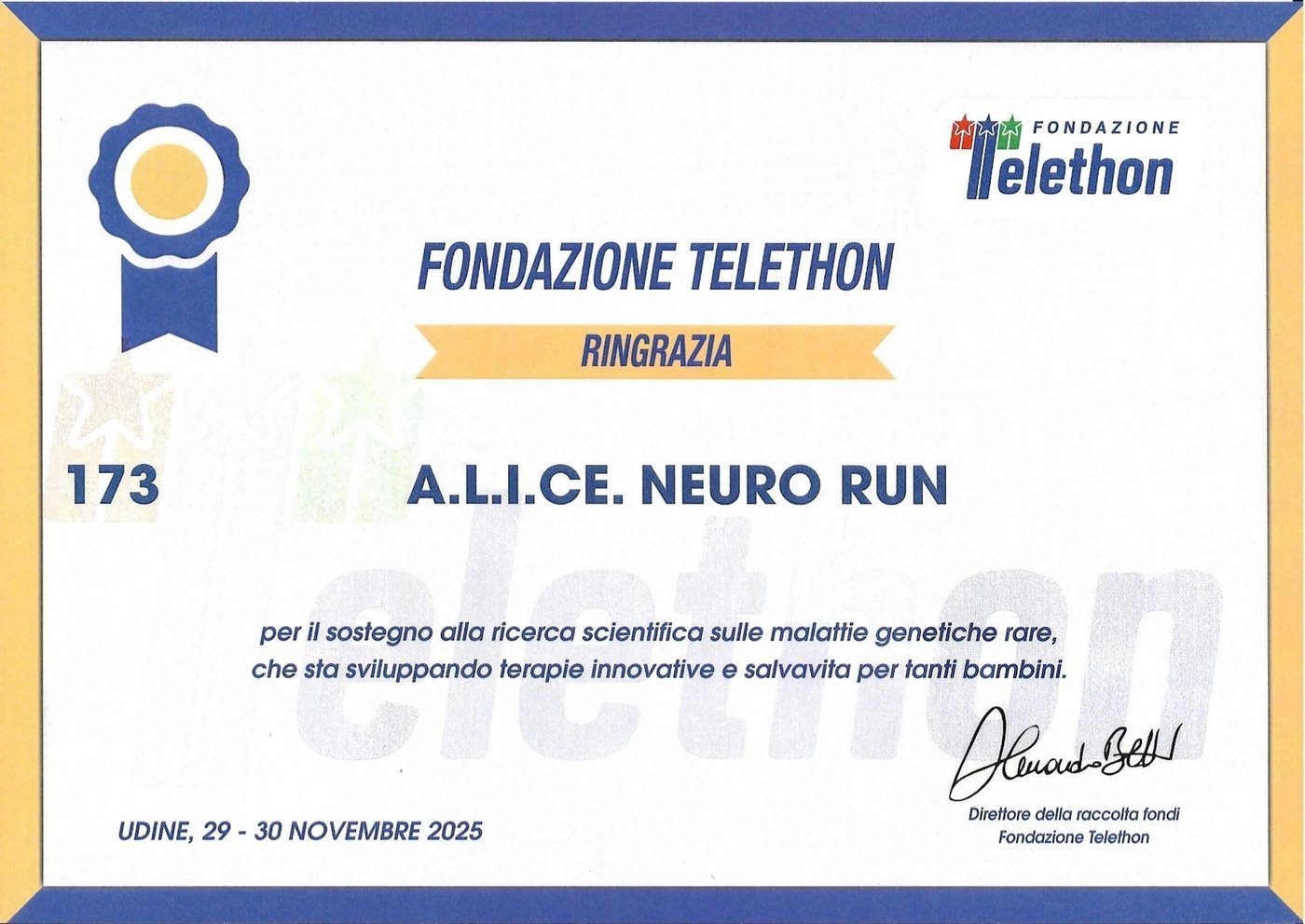 Dalle 15.00 di sabato 29 alle 15.00 di domenica 30 novembre 2025 A.L.I.Ce. Udine con la Neurologia di Udine ASU FC ha partecipato con due squadre A.L.I.Ce. Neuro Team e A.L.I.Ce. Neuro Run alla 27^ Staffetta Telethon Udine 24x1.